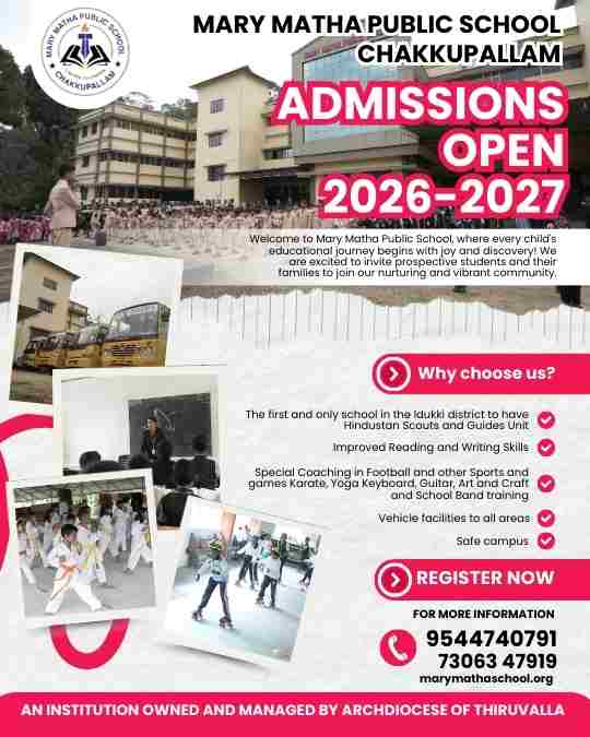Marymatha Public School, Chakkupallam, is pleased to announce that admissions for the new academic year are now open.