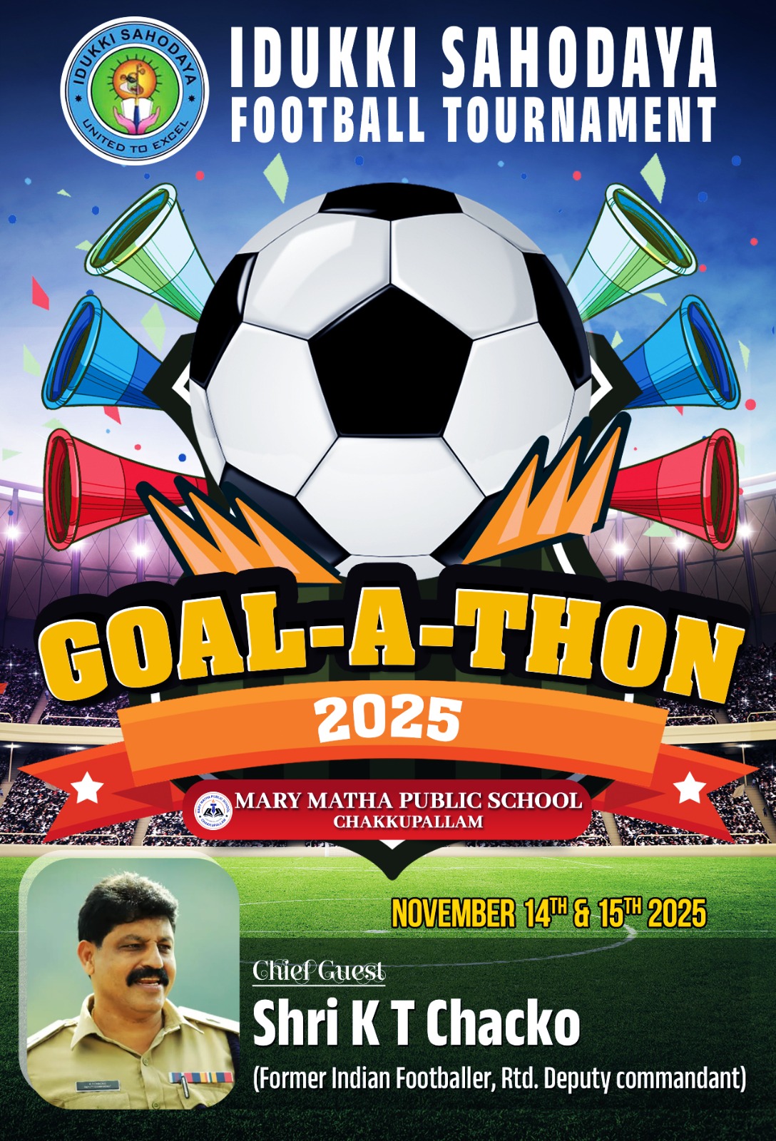 Marymatha Public School, Chakkupallam, is proud to announce GOLATHON, an Inter-School Football Tournamenthosted by Idukki Sahodaya, to be held on 14 and 15 November 2025.